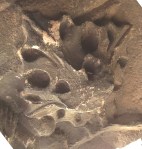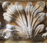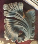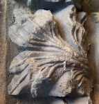 Fortunately the fireplaces at Linlithgow Palace are big enough to walk into without having to do much crouching, and since they have been abandoned and open to the elements for three or four hundred years, there’s no danger of scorching. Getting up close, I find that tucked in at the inner angles of the capitals are some small portions of the original carving which have had slight protection from the elements. They are worn and cobwebby but recognisable. Just what I came for! Undaunted by the curious stares of other (perhaps less obsessive) visitors, I climb in and, head up chimney, start taking some snapshots with my phone. Then, slightly later, I discover another original carved leaf which has become detached and is on display in a glass case in a corridor on the South Range. I take a photo of it too.