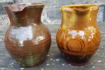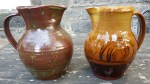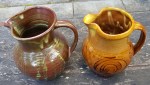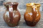 They are both big, sturdy pieces: the smaller holds two pints (that is UK Imperial pints of 20 fluid ounces, not US pints of 16 fluid ounces) and the bigger one holds rather more – but not all that much more because it has much thicker walls. The smaller jug is earthenware, and the larger is stoneware. Both are slip-glazed.