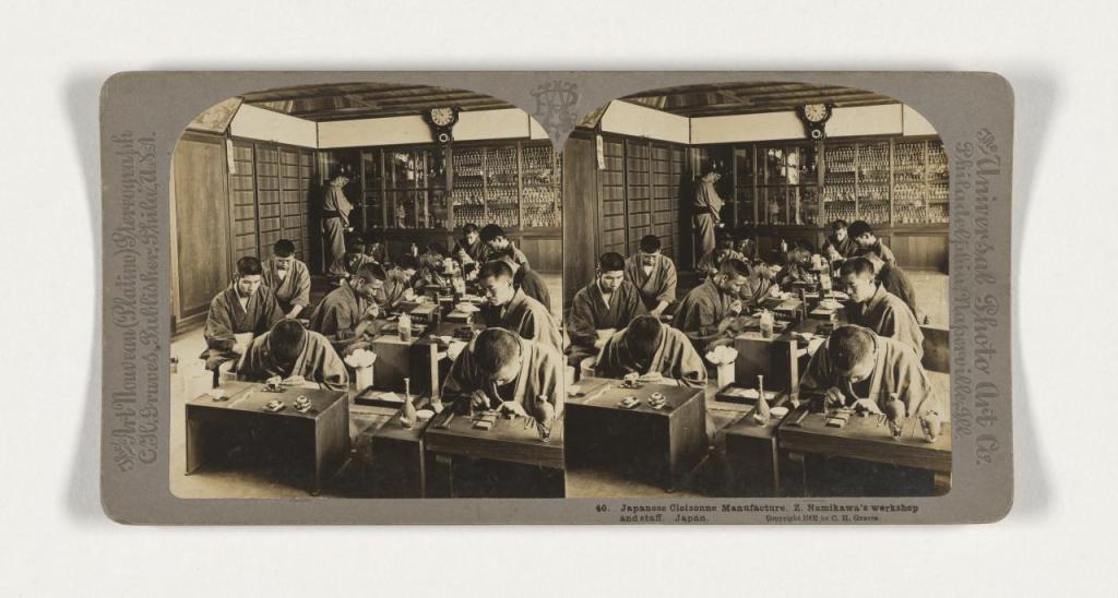 One of the photographs in Ponting’s book (also published in stereograph form) showed the Kyoto workshop of Yasuyuki Namikawa, (並河靖之) (1845-1927), who brought the “art of making cloisonne enamel … to a state of perfection never hitherto attained by any one in this or any other land”. One day recently Anne was viewing an auction sale and noticed a small cloisonné vase. It was unmarked and also unattributed in the auction catalogue, but from various clues she thought it might be an example of Namikawa’s work. So she bid for the vase and won it against stiff competition, and has now set about the task of authenticating it.