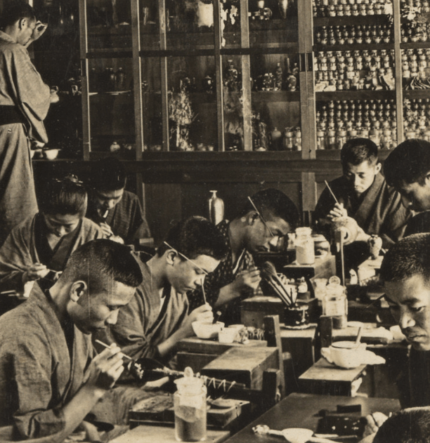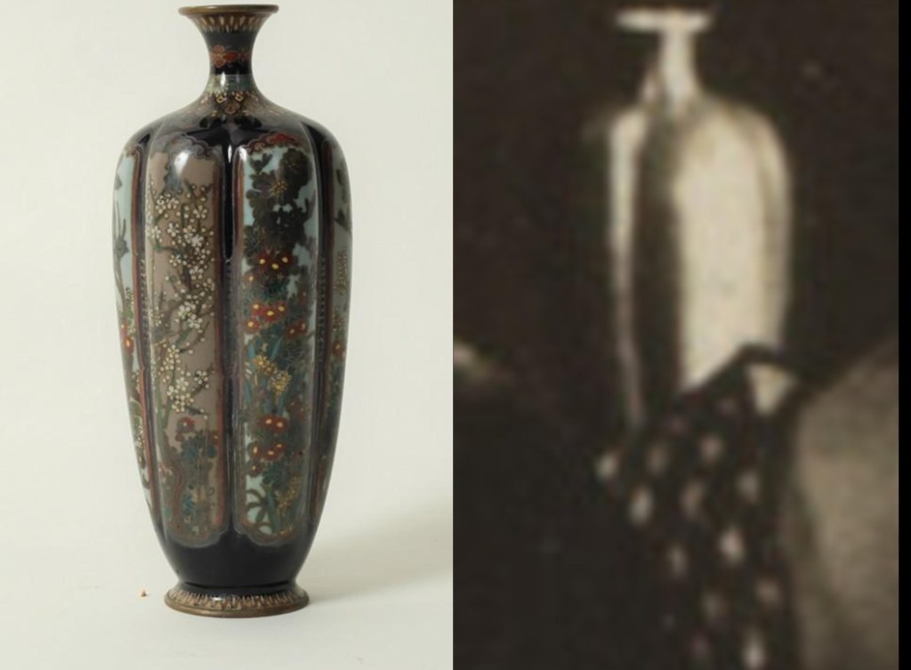 Just as I was wondering how or whether I should express my doubts to Anne that her hopes for the vase might be wishful thinking, I took another look at Ponting’s 1902 photograph of Namikawa’s workshop, and there, on a table towards the back, was a vase which appeared similar. So I enlarged and cropped the photo and placed it beside a similarly-sized image of Anne’s vase, and – voila! – the shapes are identical.