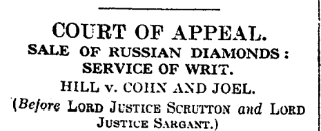 And I haven’t had time to find out more about the background to a short article which appeared in the Law Reports section of the Times newspaper in 1927 concerning a huge hoard of Russian diamonds. Have I, you might ask, discovered these diamonds in my local saleroom, still secreted in the original cigar box in which they were smuggled out of Estonia? No, sadly not. But I think I might have discovered an interesting and untold story, perhaps the germ of a new writing project. If it comes to anything, I’ll keep you informed.