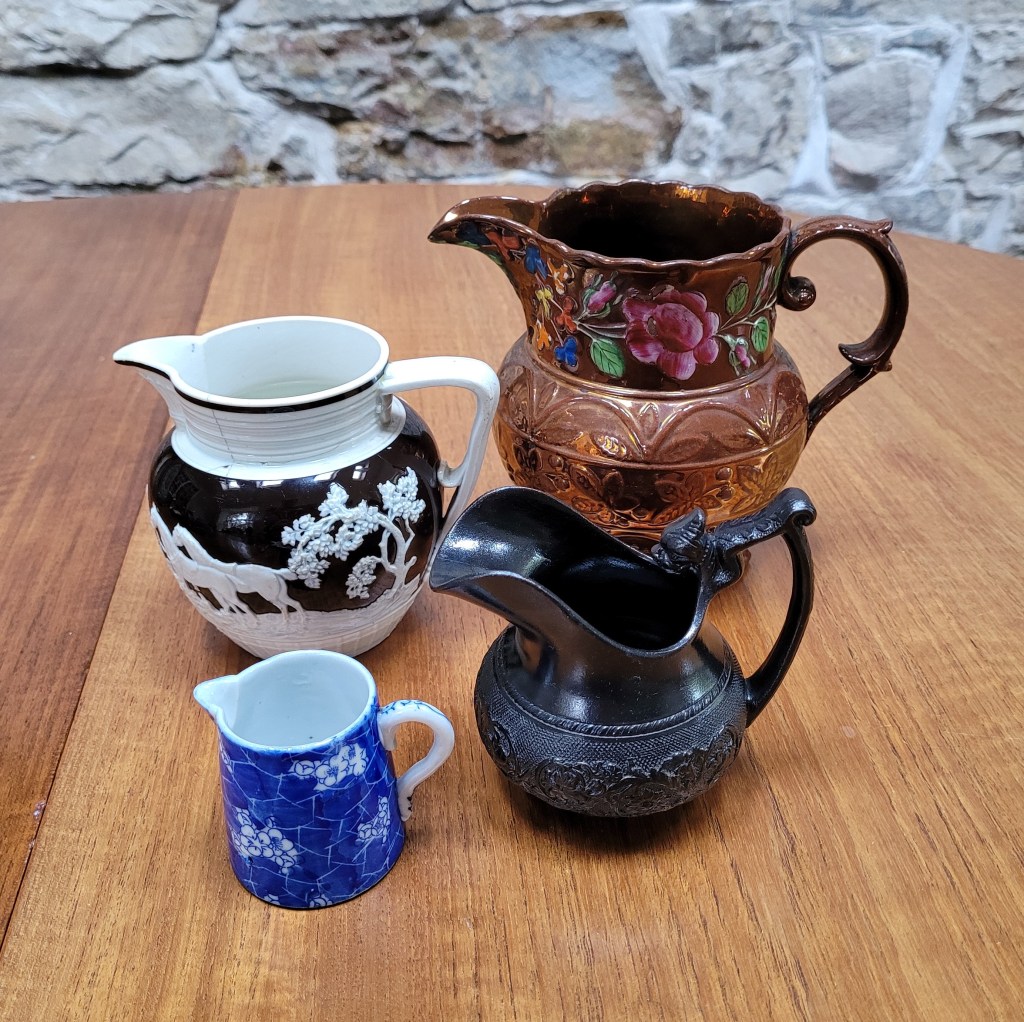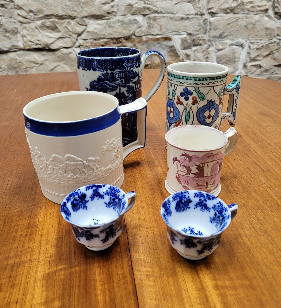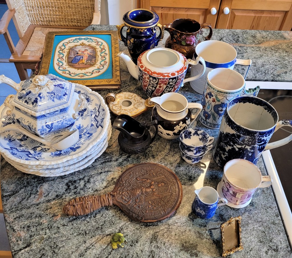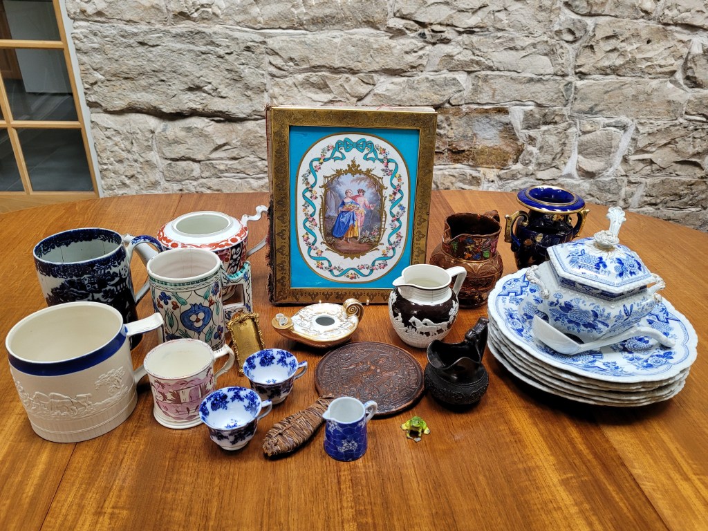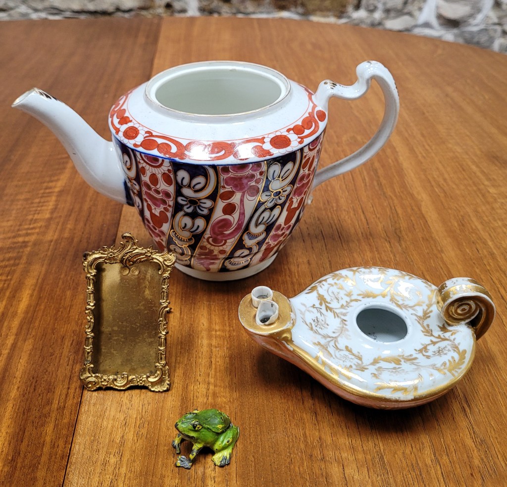 I kept back 26 pieces, mostly (as you’d expect) ceramic in nature. A Cantagalli Iznik-type tankard, a Sunderland lustre cup, a blue-and-white pearlware tankard, a set of six Ridgways stoneware plates, a matching sauce tureen with ladle and a spare ladle, a German hand mirror with stamped leather cover, a Cyples jetware jug, an early Mason’s Mazarine blue vase, a small pearlware conical jug, a sprigged stoneware tankard, a similarly sprigged porcelain jug, a desk folder or blotter with Sevres-type porcelain cover, a Scottish lustre jug, a Coalport porcelain inkwell in the form of a Roman oil lamp, two small flow-blue coffee cups, a miniature gilt metal picture frame, an 18th century Worcester teapot with no lid, and a tiny green-painted lead model of a frog.
