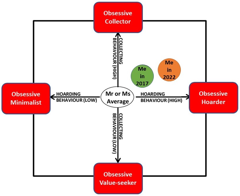 Yes, indeed, I think I’ve moved a little upward and significantly to the right. In the diagram above, the green circle (healthy) represents my hoarding/collecting health status in 2017, and the amber circle (warning!) is me right now in 2022.