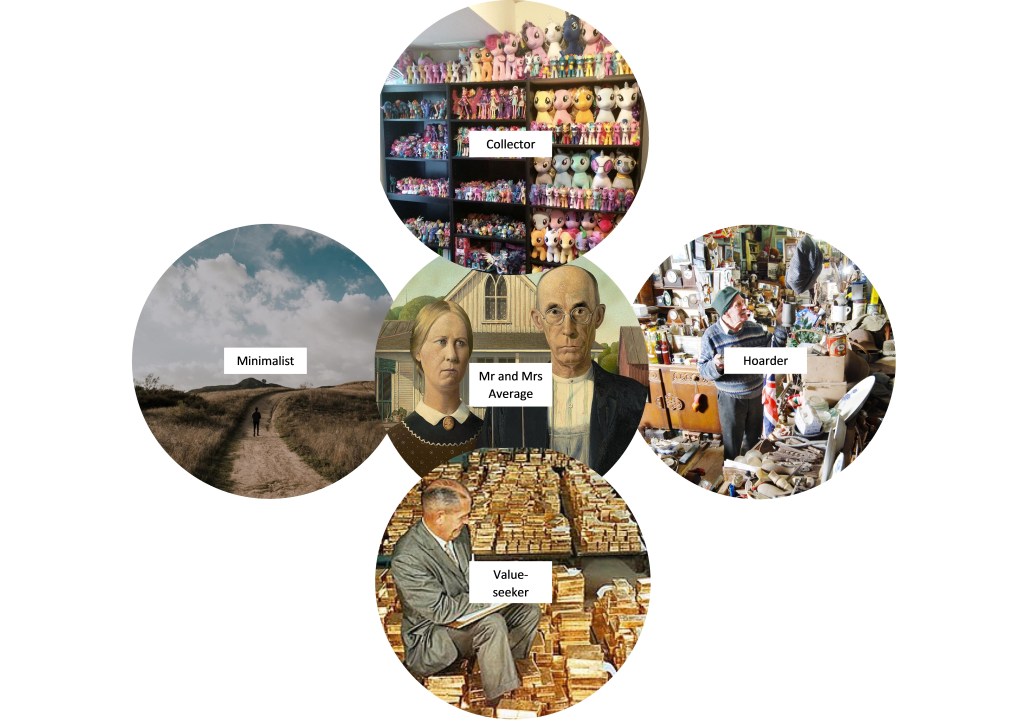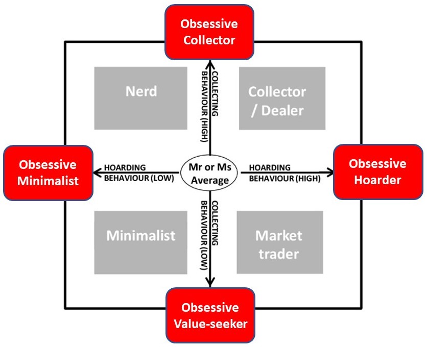 • if your hoarding and your collecting tendencies are both below average (lower left quadrant), he suggests that you exhibit minimalist behaviour, with little interest in objects but high interest in wealth
