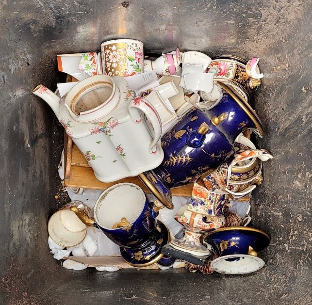 Most of the stuff was cracked or chipped or broken or incomplete. Cups without handles. Teapots with broken lids. A garniture of three vases with one complete, one with a large section missing from the base, one in three pieces. A stationery rack with half its slats missing.