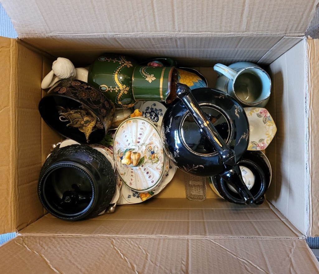 • I had sorted the stuff into three categories: a pile of objects broken beyond repair (for the rubbish bin), a box of items of interest but not to me (for the charity shop), and a display of pieces with possible collecting or re-sale value (for retention and research)