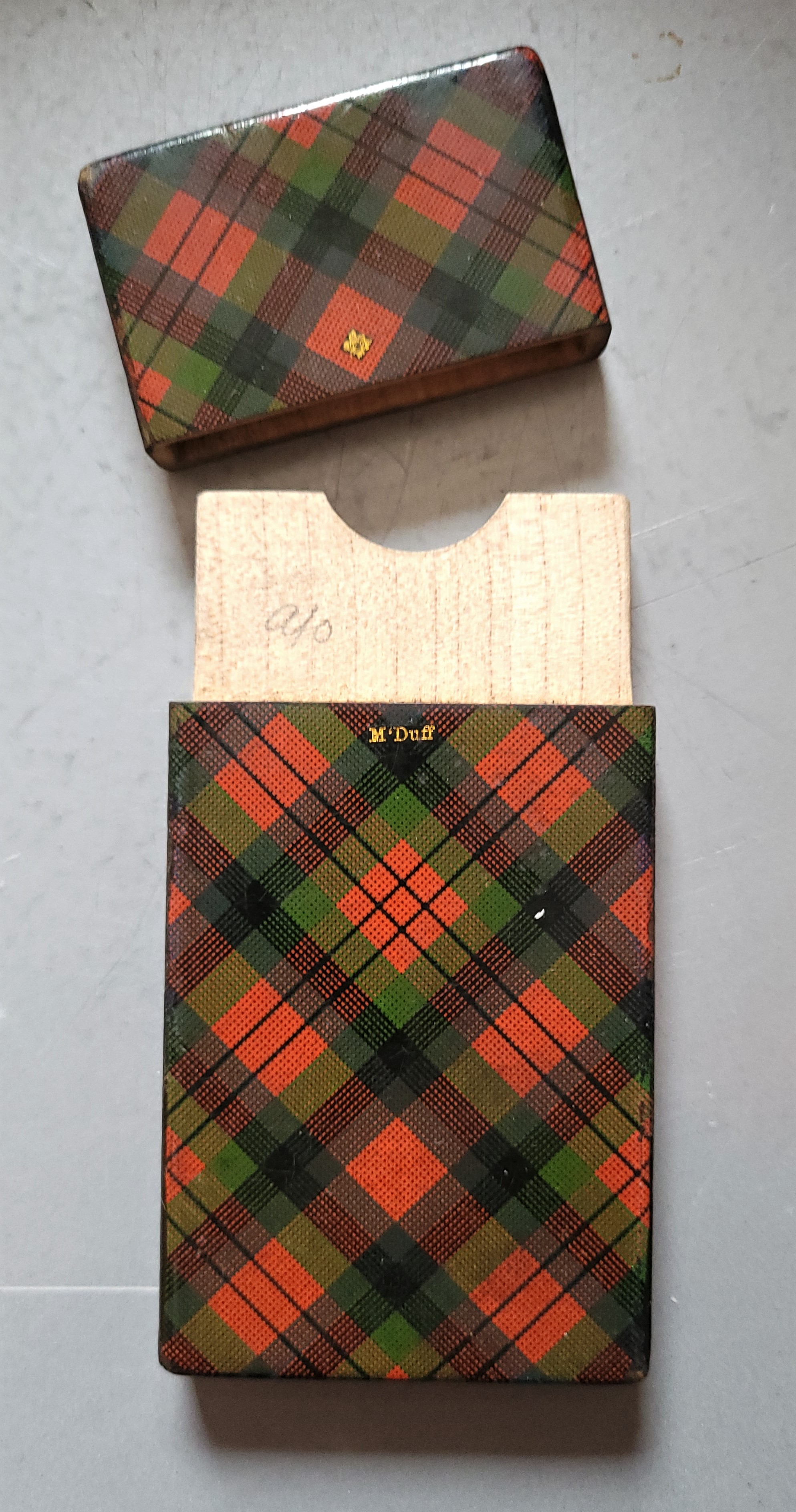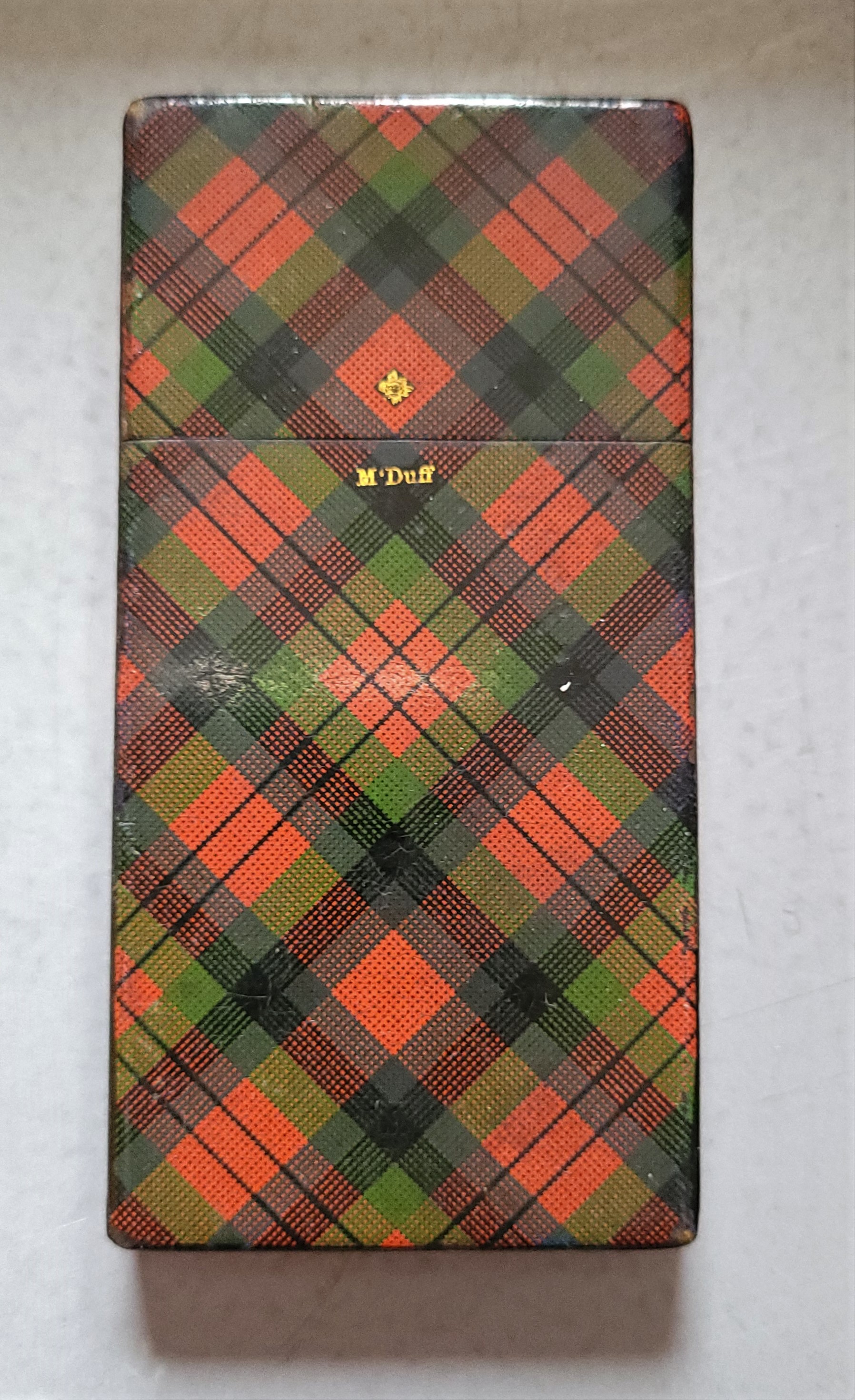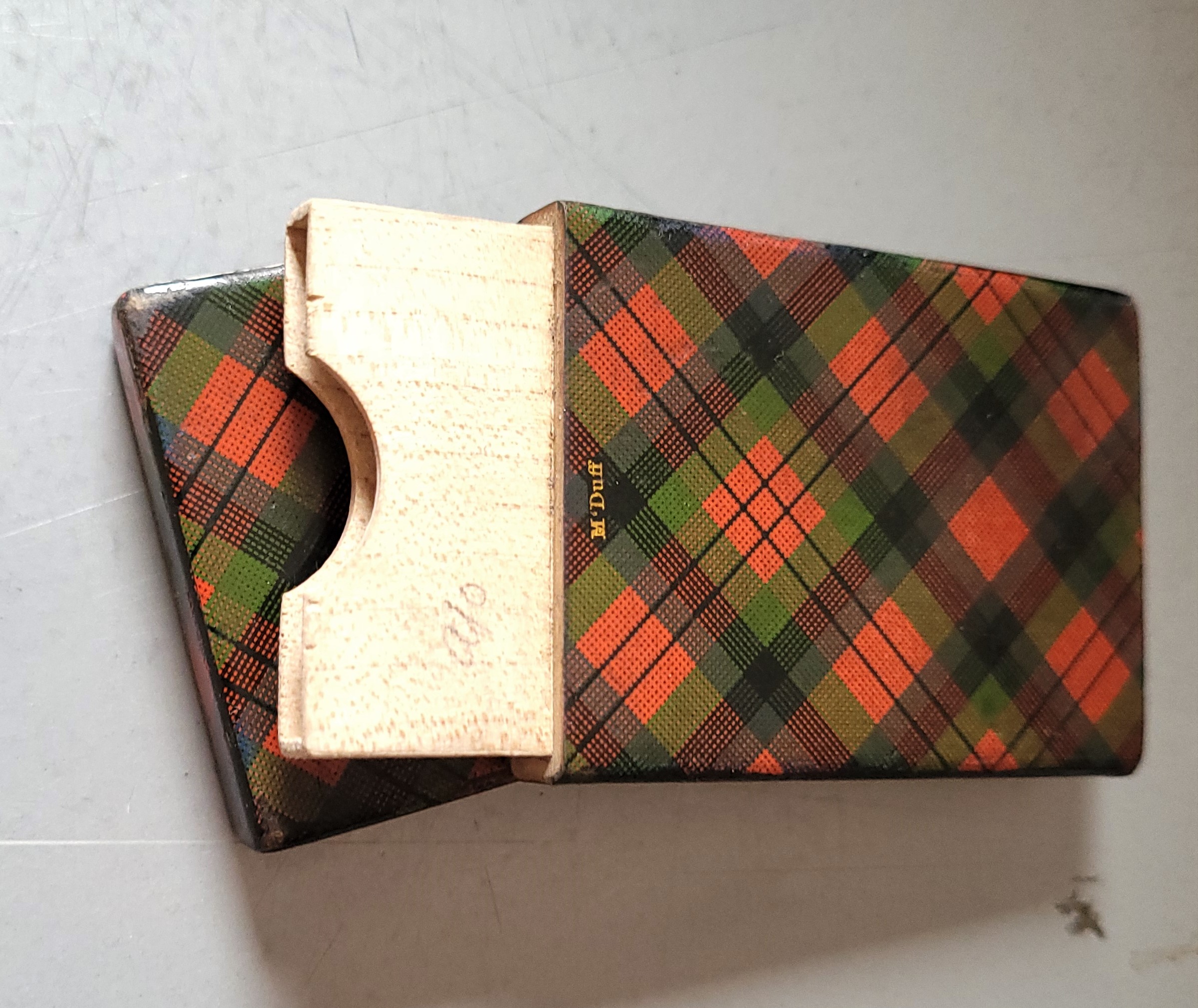 Perhaps it might be a needle case, like the one that I found in a Leith charity shop just prior to last Christmas. I think it’s a needle case, but it might be for hairpins or lacemaking bobbins or something similar. I believe it’s too narrow to be used for visiting cards. It’s small and slim, 92 mm by 45 mm by 9 mm, superbly made, covered with tartan-printed paper, with a lid which slides off smoothly to reveal an inner lip of bare wood. It is stamped in minuscule gold foil letters with the clan name McDuff.