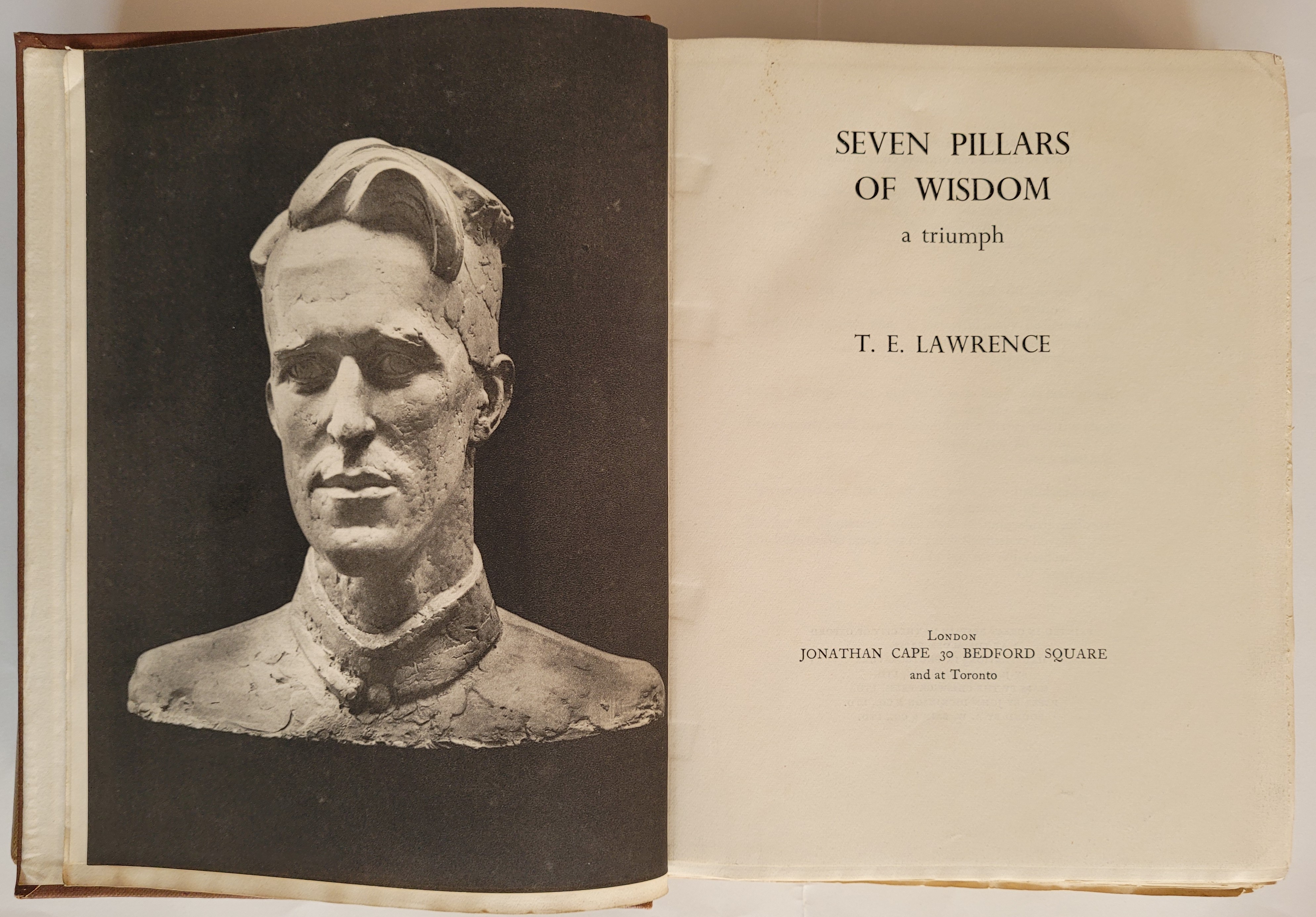 Seven Pillars of Wisdom: a triumph is by far Lawrence’s best known work. The book has a complicated printing history, but the first UK edition for general circulation was published by Jonathan Cape in 1935. I own a splendid copy of the first printing of this edition, and it’s a beautifully printed and illustrated book of 672 pages, bound in brown buckram boards with bright gilt spine lettering, the front board stamped in gold with a crossed scimitar device, the outer and lower edges untrimmed as issued. Some leaves in my copy are uncut, indicating that the book is not only unread by me, but also by anyone else.